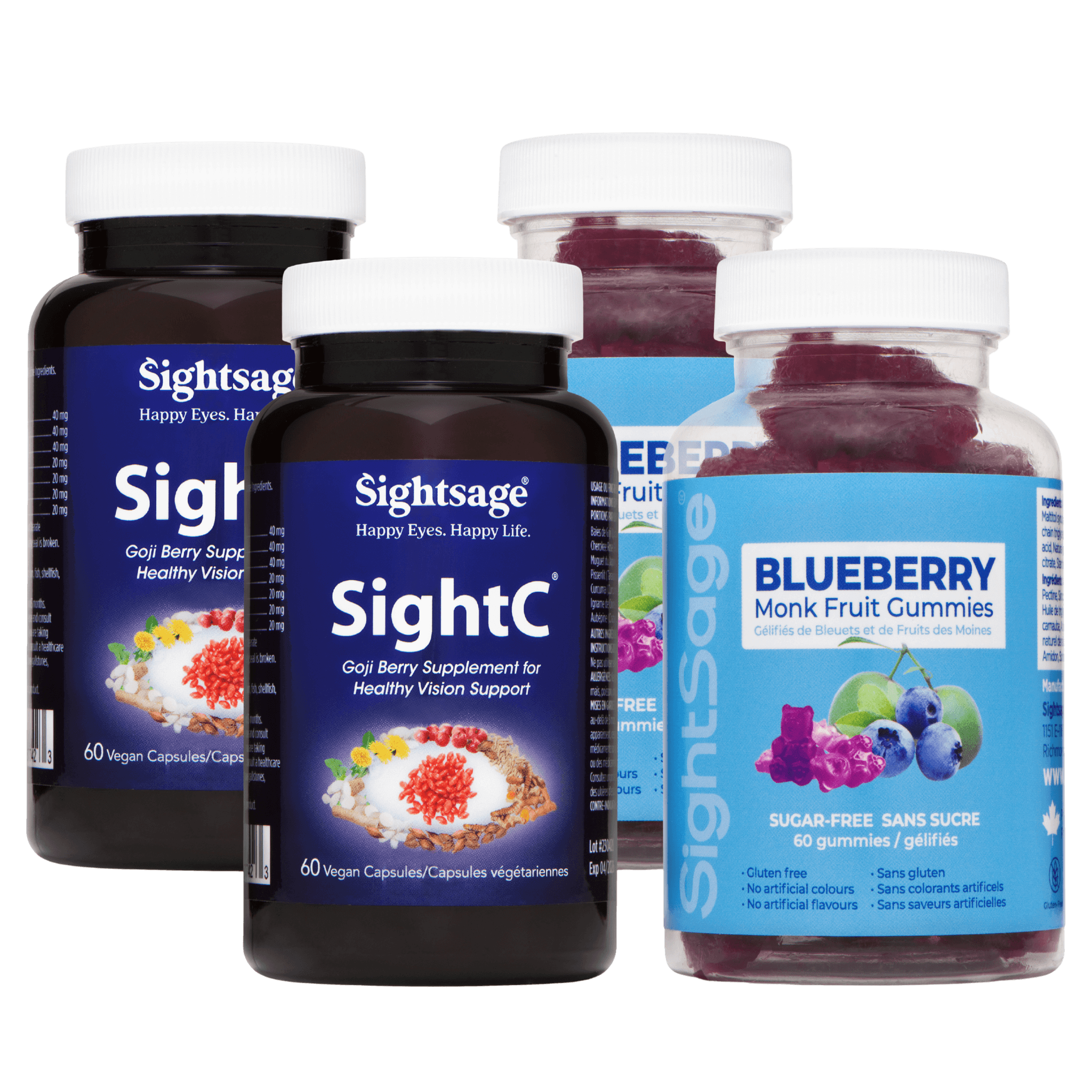 Experimente la combinación perfecta de sabiduría tradicional y ciencia moderna con nuestro paquete para alivio moderado del ojo seco. Este suministro para un mes, que incluye nuestras cápsulas SightC más vendidas y las deliciosas gomitas de arándanos, está formulado por expertos no solo para aliviar los síntomas del ojo seco sino también para promover la salud ocular en general. Es un dúo sinérgico eficaz, agradable y absolutamente natural.